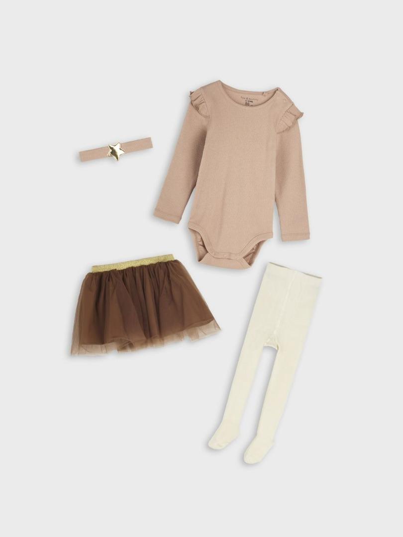 ناموجودست مجلسی نوزادی(دامن توری استردار،بادی کبریتی،جوراب شلواری،هدبند)
